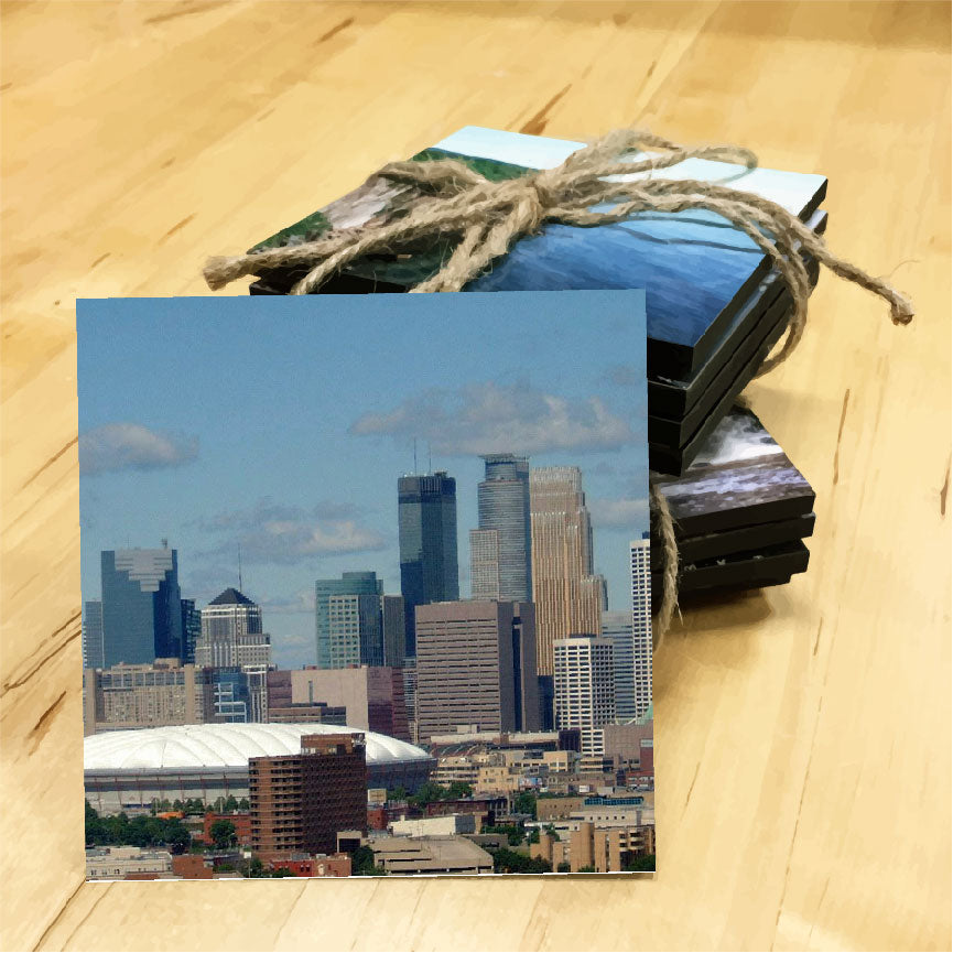 These high quality wooden coasters all feature a clear, vibrant, eye-catching design, perfect for any Minnesotan! They measure 4.5" x 4.5" and are 1/4" thick. While they ARE waterproof, they are not recommended for the dishwasher. The coasters have a cork backing, to prevent any scratching of furniture. We design and print these at our facility in Edina, MN.